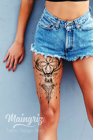 We chose to create a combination of geometric shapes on this Original Deer, the symmetry on the motif makes the visual very clean and balanced. These small pearls give a precious and delicate appearance at the same time. Mounting on our model gives a perfect preview of the final rendering once tattooed on you.